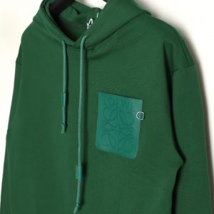 Loewe Hoodie Green Sweatshirt with Leather Pocket and Embossed Logo on the Chest