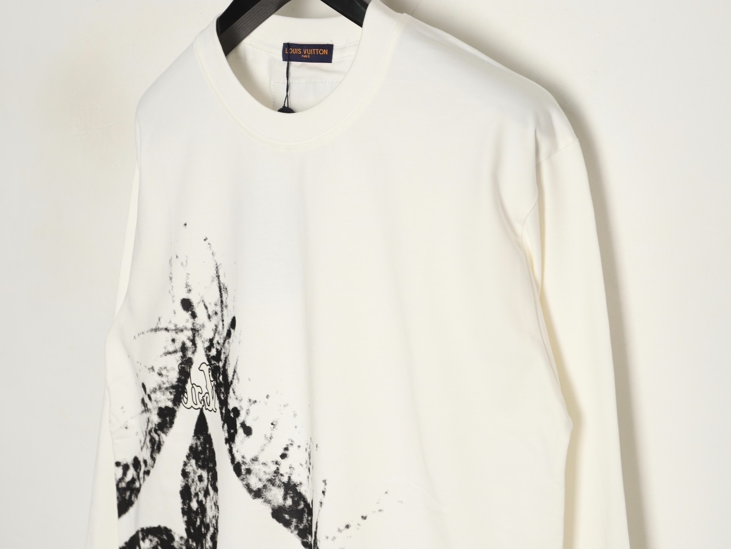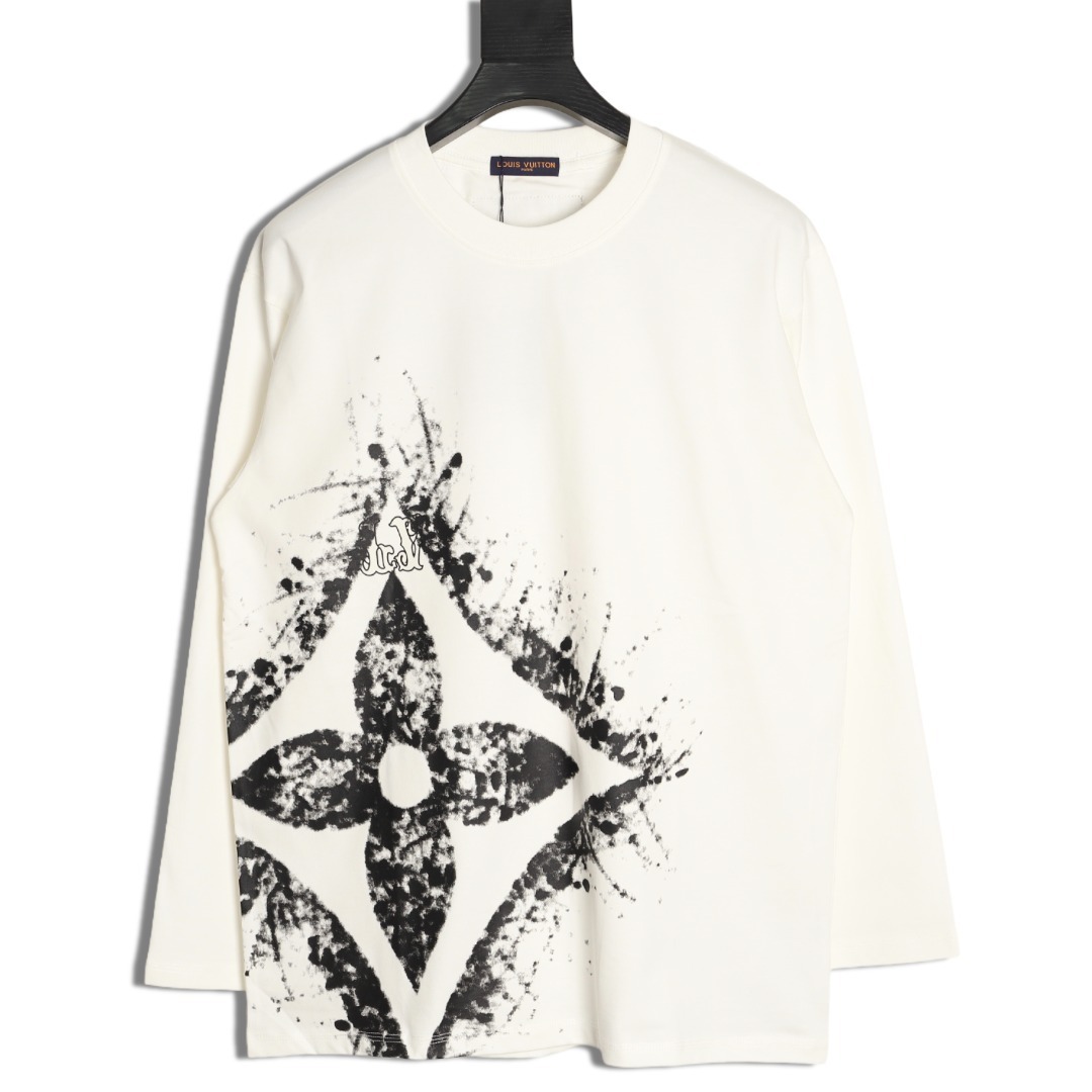Louis Vuitton long-sleeved T-shirt with ink print and large four-leaf clover logo at the hem