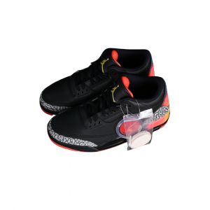 The J Balvin x Air Jordan 3 Retro ‘Rio’ takes its name from the reggaeton artist’s son. The legacy silhouette carries a black leather upper with grey elephant print overlays at the forefoot and heel. Gradient accents in Solar Flare and Total Crimson Abyss coat the back tab, marked with Nike Air branding on the left foot and J Balvin’s smiley face logo on the right. The sunset colors are repeated on the rear of the polyurethane midsole, supported by a red-tinged translucent rubber outsole.