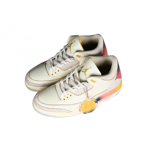 The J Balvin x Air Jordan 3 Retro ‘MedellÃn Sunset’ reunites the creative partners on a tropical colorway of the iconic silhouette. Inspired by the breathtaking sunsets of J Balvin’s hometown of Medellin, Colombia, this special-edition AJ3 sports an ivory-colored leather upper with tonal elephant print overlays at the forefoot and heel. A gradient blend of yellow, orange and dark purple lands on the rear midsole and molded back tab, featuring mismatched Nike branding on the left shoe and J Balvin’s smiley face icon on the right. An embroidered gold Jumpman graces the tongue. Undergirding the sneaker is a blue-tinged translucent rubber outsole.