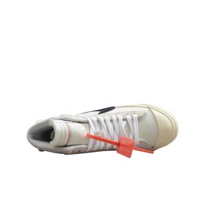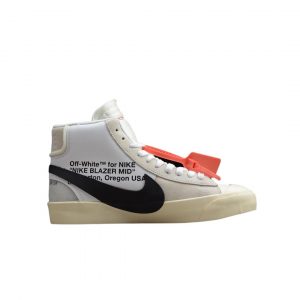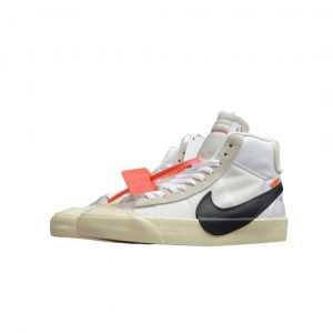 Virgil Abloh’s Nike Off-White Blazer Mid features a white leather upper with an oversized black Nike Swoosh that descends into the midsole. The four lace options ? white, black, neon orange, and neon green ? come with Abloh’s signature self-referential ?SHOELACES? branding.
