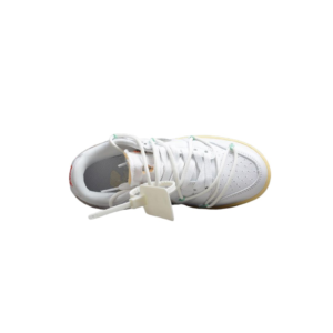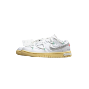 Labeled ?01 of 50,? this inaugural edition of the Off-White x Nike Dunk Low kicks off the ?Dear Summer? collection, featuring a crisp white upper built with a blend of canvas and leather. A metallic silver Swoosh cuts through the side panel, while supplemental rope laces zigzag across the upper, looping through integrated Flywire cables that emerge from strategically placed eyelets. A pre-yellowed midsole combines with an exposed foam tongue to give the shoe a vintage aesthetic. Virgil Abloh?s signature touches include a white plastic zip tie, an off-center tongue tag and lines of Helvetica text on the medial side.