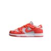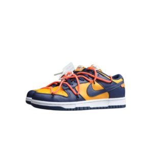 Arrived in December 2019, Off-White and Nike continue their creative partnership by revisiting the Dunk Low for a three-piece capsule. This edition in University Gold and navy leather sports a signature orange flag label on the lateral Swoosh. Virgil Abloh’s deconstructed style is exhibited in the form of secondary Flywire lacing, exposed tongue foam and enlarged branding on the medial. The sneaker’s split-colored rubber cupsole remains.