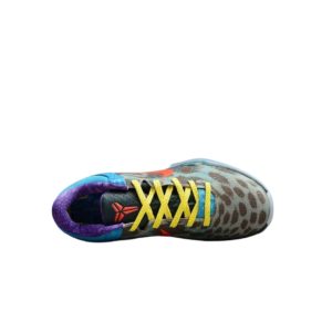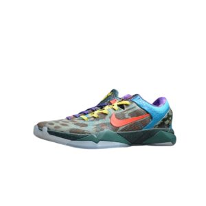 The Kobe 7 System comes with two interchangeable insert options allowing players to switch out the cushioning and ankle support to match their style of play. The ?Attack Fast? insert includes a Phylon midsole with Nike Zoom units in the forefoot and heel for lightweight responsiveness, and the ?Attack Strong? offers more protection and support with its full-length Cushlon midsole and padded ankle cuff. This ?What The Kobe? model, inspired by the mash-up concept first introduced by Nike SB in 2007, blends together several different Kobe 7 colorways including the Mamba Snake, Cheetah, Poison Dart Frog, and Shark. Other details include Kevlar Flywire technology and a carbon fiber external heel counter.
