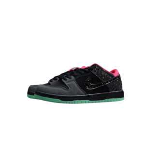 Michigan?s Premier Skate dropped this ?Northern Lights? edition of Nike SB?s Dunk Low Premium in 2014. Inspired by the colors of the Aurora Borealis, the shoe features an inky black nubuck upper inspired by the night sky, dark grey suede overlays at the toe, and reflective starry detailing on the heel and Swoosh. It also features Hot Pink hits on the heel and lining and glow-in-the-dark Green Glow outsoles. Gold aglets on the laces and Premier branding on the tongue and insole also distinguish this limited November 2014 release.